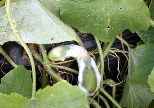 - Putregaiul alb al tulpinii si fructelor de castraveti (Scerotinia sclerotiorum). Frecventa si intensitatea atacului sunt determinate de umiditatea mare din sol si atmosfera (peste 75%).