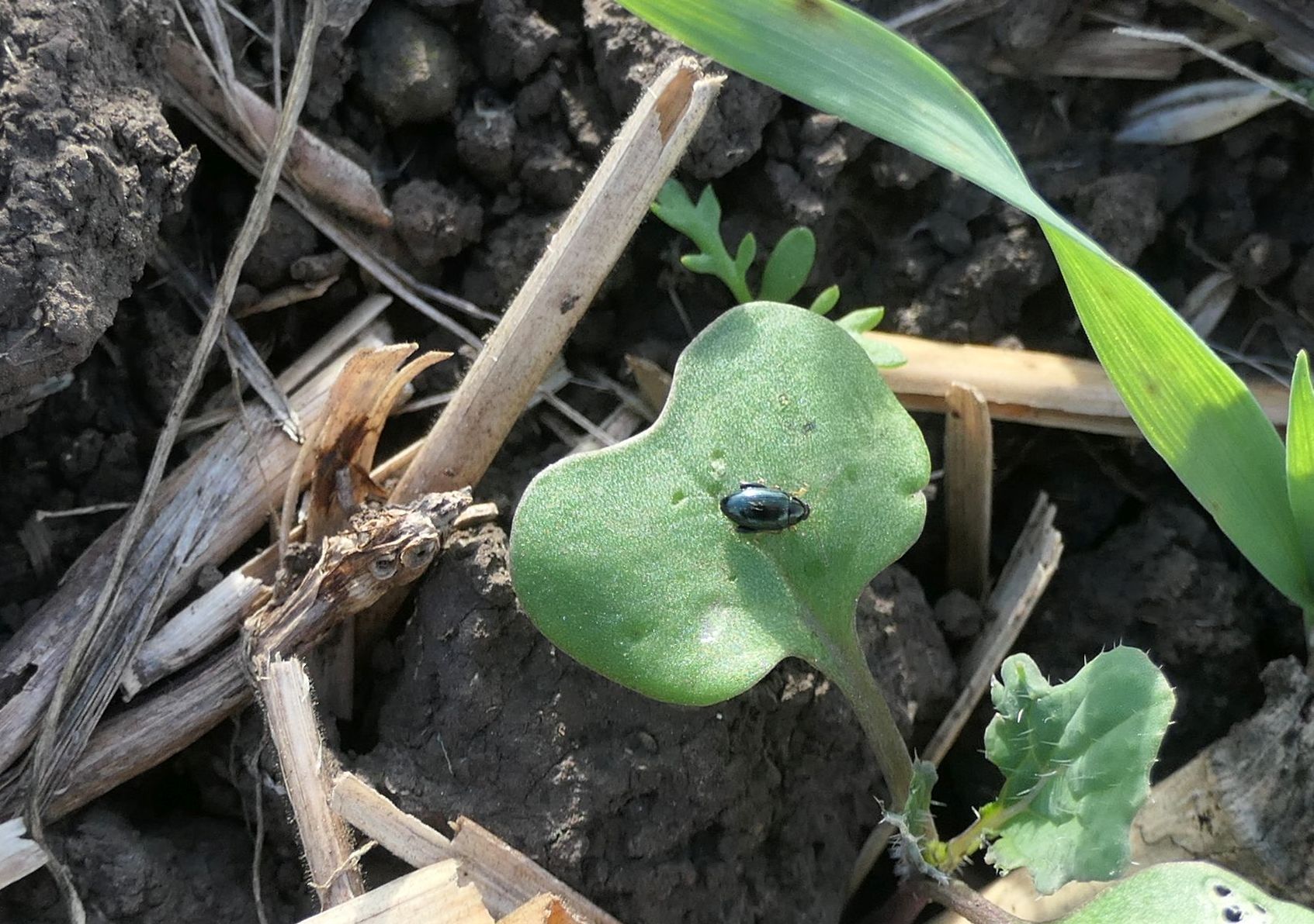Puricele cruciferelor (Psylliodes chrysocephala) ascunzandu-se in resturile vegetale de orz