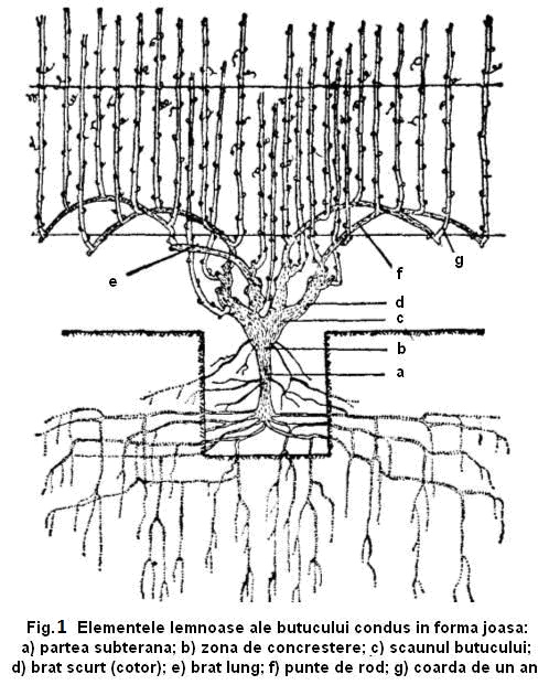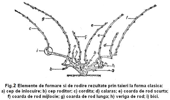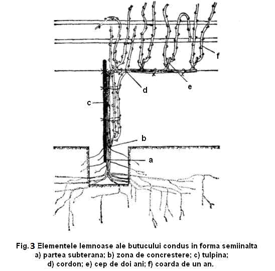 Coarda de rod propriu-zisă, cuplată cu un cep de înlocuire, ambele situate pe acelaşi suport (ax) de lemn de 2 ani, formează veriga de rod. Elementele lemnoase la butucii conduşi în forma semiinalta şi înaltă sunt redate în figura 3.